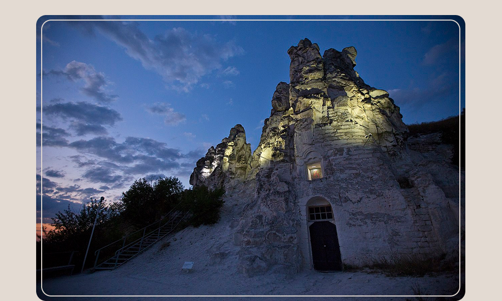Рис. 7. Пещерный комплекс с храмом Сицилийской иконы Божией Матери, вырубленный в меловом останце, хутор Дивногорье, Воронежская область (Фото: Википедия // Фывапрол1).
