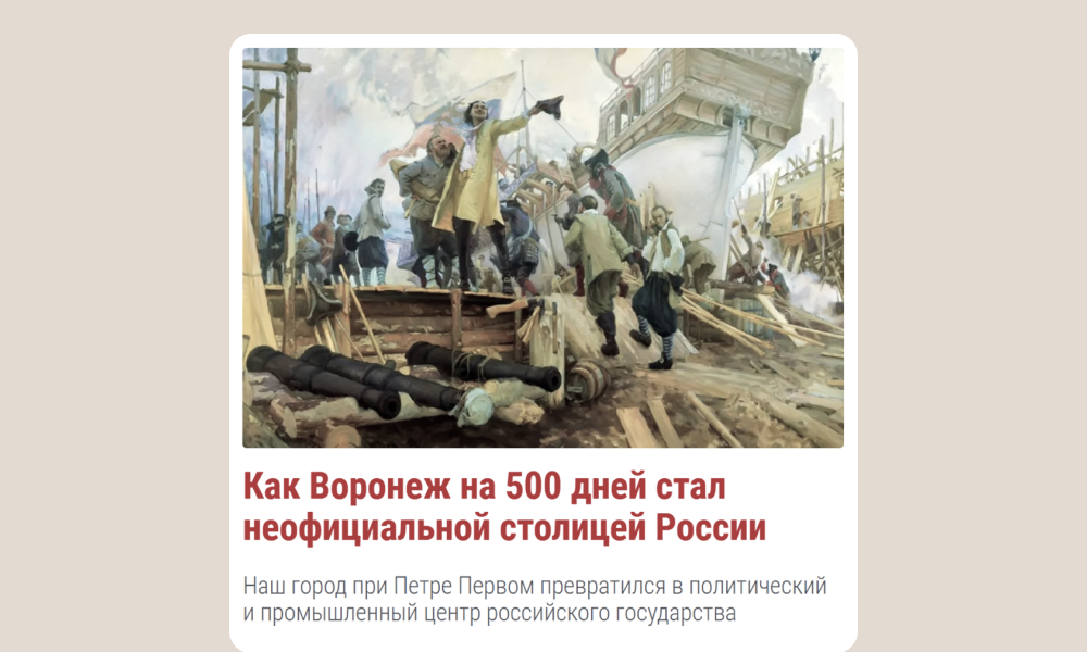 В этом плане Северная столица подобна салату, сделанному из ингредиентов с яркими вкусами, где каждый перетягивает на себя внимание. И, безусловно, Пётр I стоит во главе пантеона героев города с его именем в названии, но питерцы «избалованы» яркими персоналиями всех мастей (от поэтов и писателей до военных и политиков), поэтому им не понять ту любовь, которую испытывают к Петру воронежцы. Для них это не просто один из череды монархов, но ещё и один из самых ярких эпизодов местной истории!
